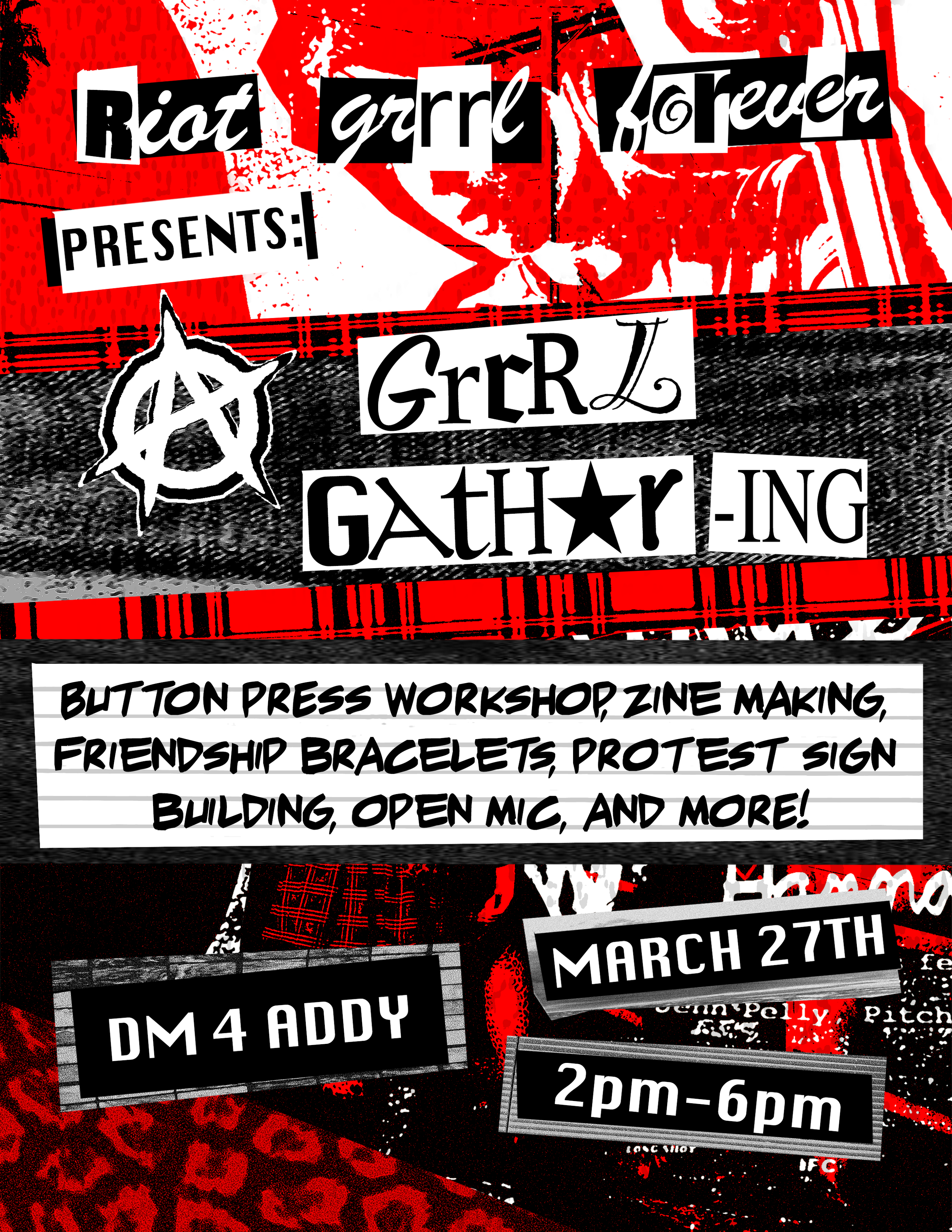 Riot Grrrl Forever is a DIY feminist space that pays homage to the original spirit of what Riot Grrrl was while making room for where we are today. RGF was created to foster community within punks and to be a space of its own in spite of the male dominated spaces that are in LA.